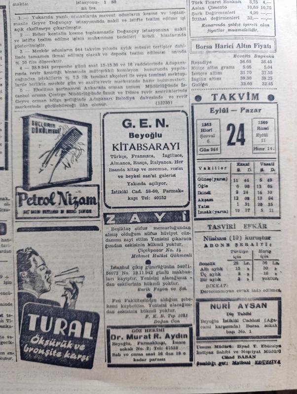 Tasviri Efkar Gazetesi - 24 Eylül 1944 - günün yazısı hususi teşebbüsün güzel ve hayırlı bir numunesi - Bulgaristan'da umumi seferberlik vaziyeti ilan edildi - Macaristan'a karşı Rus taarruzu başladı - Türkiye'nin mülteciler hakkındaki kararı - Batı cephesi'nin haritada son vaziyeti - kurtarılan Yunanistan'dan yazan Kadri Kayabal - Sabık Roma polis şefi Pietro Caruso idam edilmiştir - Roosevelt'in Çin hakkında beyanatı - İsviçre Nazi şeflerini kabul etmeyecek - İnhisar Maddelerinin Fiyatları İndirilecek - pazardan pazara yazan Server Bedi - Ada Kuşları yazan Jeanne Galzy Yazı Dizisi - harpten sonra Almanya Ve sulh Yazan Georg W. Norris - Galatasaray kulübü'nün senelik Kongresi - hareket harbi ve siyasi durum yazan Muharrem Fevzi Togay - Dil Bayramı - De Gaulle Vichy'ci siyaset adamlarını vazifelerinden affetti - Fenerbahçe stadında Fenerbahçe Vefa Maçı - Hasan Traş Kremi - saç bakımı için Petrol Nizam - donanma gecesi ve kudret helvası oyunları Beyoğlu ses tiyatrosunda - borsa, Ziyad Ebüzziya tarafından kaleme alınmıştır. Tasviri Efkar Gazetesi - 24 Eylül 1944 - günün yazısı hususi teşebbüsün güzel ve hayırlı bir numunesi - Bulgaristan'da umumi seferberlik vaziyeti ilan edildi - Macaristan'a karşı Rus taarruzu başladı - Türkiye'nin mülteciler hakkındaki kararı - Batı cephesi'nin haritada son vaziyeti - kurtarılan Yunanistan'dan yazan Kadri Kayabal - Sabık Roma polis şefi Pietro Caruso idam edilmiştir - Roosevelt'in Çin hakkında beyanatı - İsviçre Nazi şeflerini kabul etmeyecek - İnhisar Maddelerinin Fiyatları İndirilecek - pazardan pazara yazan Server Bedi - Ada Kuşları yazan Jeanne Galzy Yazı Dizisi - harpten sonra Almanya Ve sulh Yazan Georg W. Norris - Galatasaray kulübü'nün senelik Kongresi - hareket harbi ve siyasi durum yazan Muharrem Fevzi Togay - Dil Bayramı - De Gaulle Vichy'ci siyaset adamlarını vazifelerinden affetti - Fenerbahçe stadında Fenerbahçe Vefa Maçı - Hasan Traş Kremi - saç bakımı için Petrol Nizam - donanma gecesi ve kudret helvası oyunları Beyoğlu ses tiyatrosunda - borsa adlı eser Türkçe dilindedir.