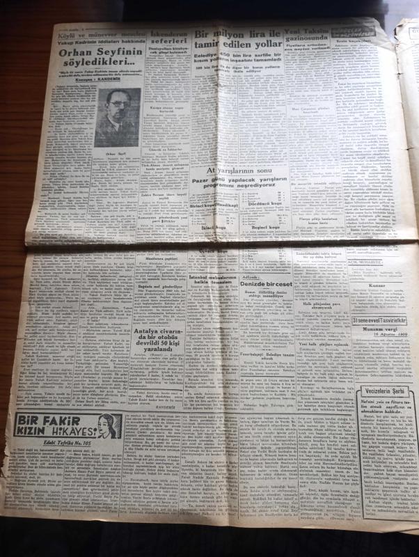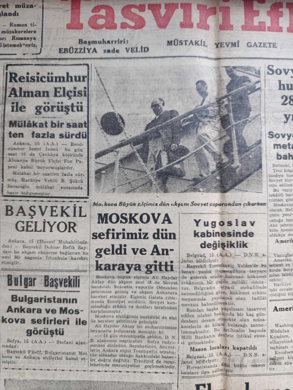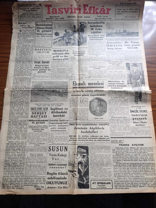 Tasviri Efkar Gazetesi - Turkish Newspaper - 16 Ağustos 1940 - İngiltere için dehşet haftası yazan Ebuzziya Zade Velid Başmakale - Reisicumhur İsmet İnönü Alman Elçisi İle görüştü - Moskova elçimiz Ali Haydar Aktay akşam Sovyet vapurundan çıkarken fotoğraf - başvekil Refik Saydam İstanbul'a geliyor - Sovyetler Fin hududuna 28 fırka yığdılar - Arnavutluk'ta İtalya'ya karşı isyan - bir Yunan harp gemisi batırıldı - İngiltere taarruza geçecek - ekmek meselesi belediye cezaları fırınlar arasında taksim ediliyor - İngiltere için dehşet haftası - Hitler Ordu erkanı ile görüştü - Alman hava taarruzuna en çok maruz kalan İngiliz şehirlerinden Liverpool fotoğraf - İsmet İnönü'nün köylülerle hasbihali - Orhan Seyfi'nin söyledikleri konuşan Kandemir - at yarışlarının sonu - hikaye bir sanat sırrı yazan Mahmut Yesari Yazı Dizisi - halk plajından para alınmayacak - Türk şehri neydi ne olmalıdır yazan Hilmi Ziya Ülken - yüzme teşvik müsabakaları - Tuzla İçmeleri - Poker tıraş bıçakları - Yeni kolej, Ziyad Ebüzziya tarafından kaleme alınmıştır. Tasviri Efkar Gazetesi - Turkish Newspaper - 16 Ağustos 1940 - İngiltere için dehşet haftası yazan Ebuzziya Zade Velid Başmakale - Reisicumhur İsmet İnönü Alman Elçisi İle görüştü - Moskova elçimiz Ali Haydar Aktay akşam Sovyet vapurundan çıkarken fotoğraf - başvekil Refik Saydam İstanbul'a geliyor - Sovyetler Fin hududuna 28 fırka yığdılar - Arnavutluk'ta İtalya'ya karşı isyan - bir Yunan harp gemisi batırıldı - İngiltere taarruza geçecek - ekmek meselesi belediye cezaları fırınlar arasında taksim ediliyor - İngiltere için dehşet haftası - Hitler Ordu erkanı ile görüştü - Alman hava taarruzuna en çok maruz kalan İngiliz şehirlerinden Liverpool fotoğraf - İsmet İnönü'nün köylülerle hasbihali - Orhan Seyfi'nin söyledikleri konuşan Kandemir - at yarışlarının sonu - hikaye bir sanat sırrı yazan Mahmut Yesari Yazı Dizisi - halk plajından para alınmayacak - Türk şehri neydi ne olmalıdır yazan Hilmi Ziya Ülken - yüzme teşvik müsabakaları - Tuzla İçmeleri - Poker tıraş bıçakları - Yeni kolej adlı eser Türkçe dilindedir.