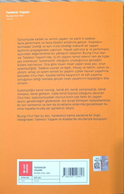 Tefekkür Yaşamı: Ya da Eylemsizlik Üzerine, Byung Chul Han tarafından kaleme alınmıştır. Kitap Ketebe tarafından yayınlanmıştır. Tefekkür Yaşamı: Ya da Eylemsizlik Üzerine adlı eser Türkçe dilindedir.