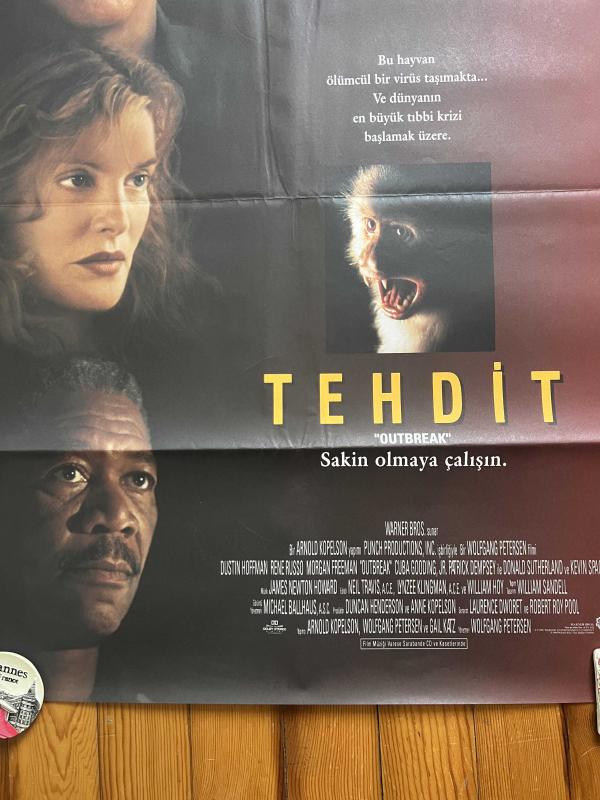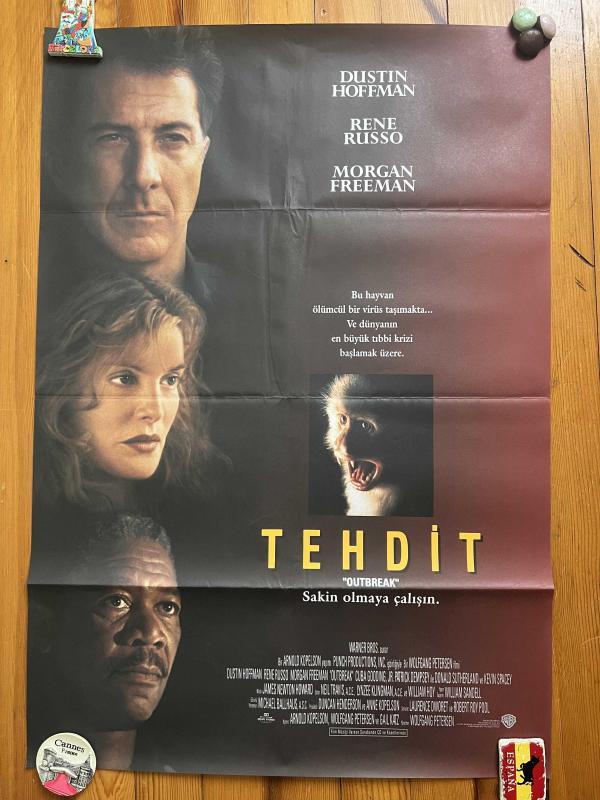 Tehdit (Outbreak, 1995) filmine ait orijinal Türkçe sinema afişidir. Dustin Hoffman, Morgan Freeman ve Rene Russo’nun başrollerinde yer aldığı film, pandemi temalı ilk büyük Hollywood yapımlarından biri olarak kabul edilir. Ölçüleri 62 x 90 cm’dir. Afiş, Türkiye’de vizyona girdiği dönemde sinema salonlarına gönderilmiş orijinal dönem baskısıdır. Kondisyon bilgisi: – Genel durumu iyi seviyededir. – Kat izleri mevcuttur ancak renkler canlı, yazılar net durumdadır. – Görsel bütünlük etkileyici biçimde korunmuştur. Detaylar fotoğraflarda görülebilir. Pandemi konulu sinema afişleri arasında öncü sayılan bu parça, hem sinema tutkunları hem de koleksiyoncular için özel bir yer taşır. Afiş, zarar görmeyecek şekilde rulo yapılarak özenle paketlenip gönderilecektir.