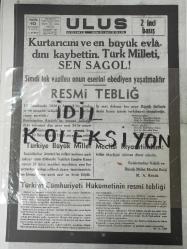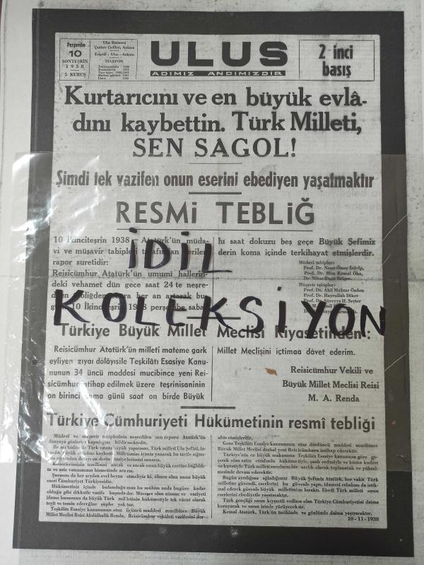 Tıpkı Basım - Ulus Gazetesi - 2 inci basış - Newspaper - 10 Sonteşrin 1938 - 10 Kasım 1938 - 10 November 1938 - Kurtarıcını ve en büyük evladını kaybettin. Türk Milleti, sen sagol - Şimdi tek vazifen onun eserini ebediyen yaşatmaktır - Resmi Tebliğ - Türkiye Büyük Millet Meclisi riyasetinden - Türkiye Cumhuriyeti Hükümetinin resmi tebliği - Zamana bağlı olarak yırtılmalar, sararmalar, yıpranmalar görülebilir