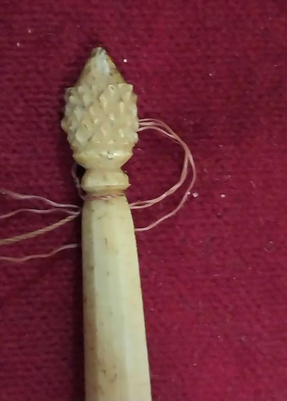 Tekke İşi Kaşık, OSMANLI DÖNEMİ MEVLEVİ SİKKE KAŞIK Osmanlı dönemi Fildişi Saplı ve boynuzdan mamúl, gövde kısmı işleme süslemeli, mevlevi sikkeli kaşık 5,5 x 25,5 cm. başlıklı antika/koleksiyon objesi Osmanlı menşe’lidir. 1900-1919 arası dönemine aittir.