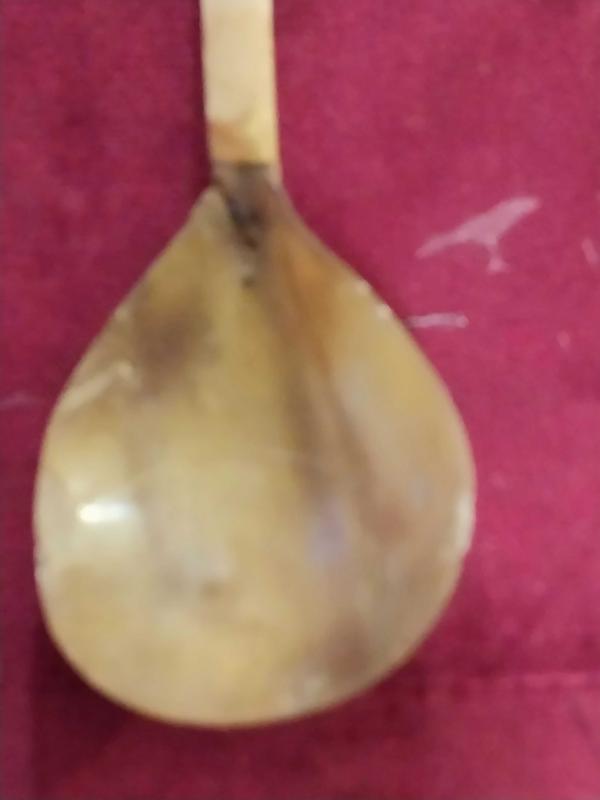 Tekke İşi Kaşık, OSMANLI DÖNEMİ MEVLEVİ SİKKE KAŞIK Osmanlı dönemi Fildişi ve boynuzdan mamúl, gövde kısmı işleme süslemeli, mevlevi sikkeli kaşık 5,5 x 25,5 cm.