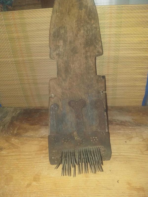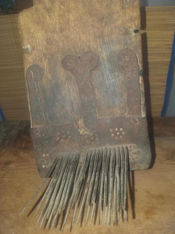 Döneminde iplik yapmak üzere keten veya yünün tarandığı ,tarağın dişlerinin her biri dövme demirden imal edilerek ahşap gövdeye tek tek çakılmış ve inanılmaz bir ustalık sergilenmiştir , taragın dişlerinin çakıldığı metal kısımda ise çiçek ve koçbaşı desenleri ile nadir, gövdesi ise eskirken çok güzel patine almış , yüzeyleri yörük işi ,türkmen işi oymalarla süslü tekke işi yün veya keten tarağı... kullanım amacını değiştirerek zamanımıza uyarlarsak kendisi raf olarak kullanılabilir veya mevcut rafa ya da masaya konularak kitap tutucu olarak kullanılabilir ve şık olur... Kullanım aleti , reprodüksiyon , reproduction , ethnografik sanat , ethnografic art . folk art...