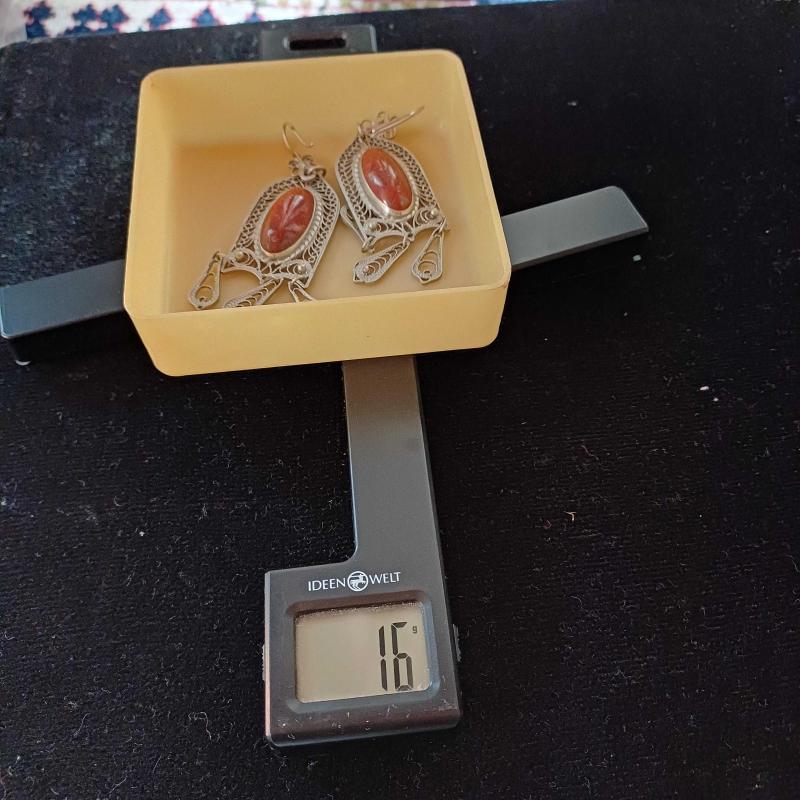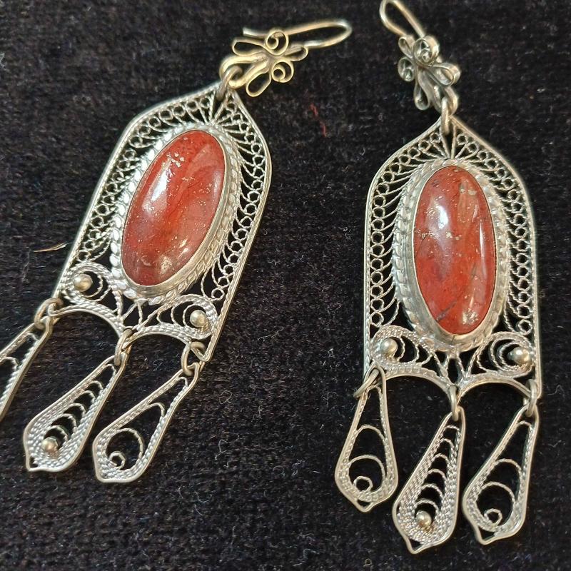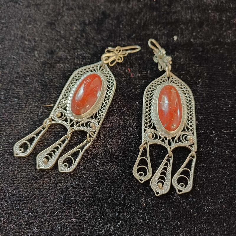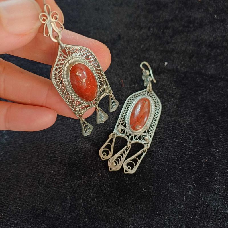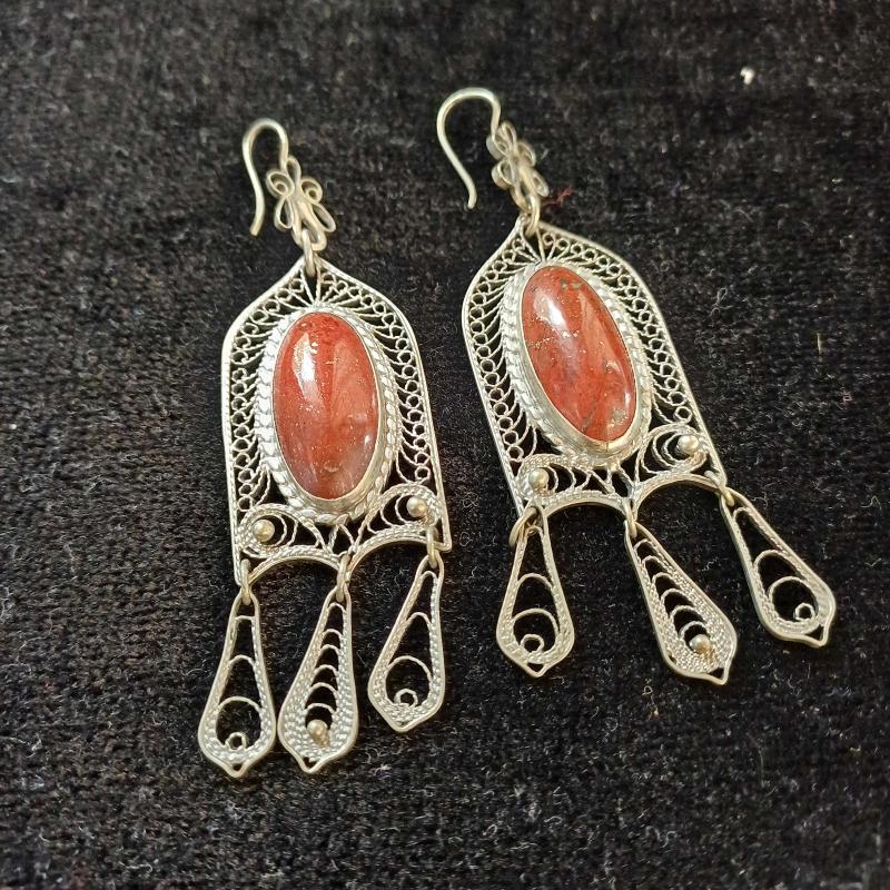 Etnik sitilde. El işcilikli. Uzun ve sallantili. Dogal tasli. 925 ayar gümüş. 6 x 2,5 cm 16 gram.