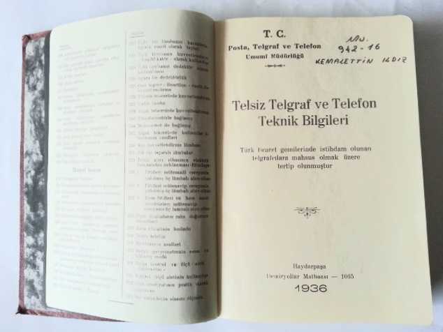 "Türk Ticaret Gemilerinde İstihdam Olunan Telgrafcılara Mahsus Olmak Üzere Tertip Olunmuştur" Orijinal bez cildinde. (Künye sayfasında eski sahibinin adı.) Sayfa Bilgisi: 318 s. Ebat: 15x20