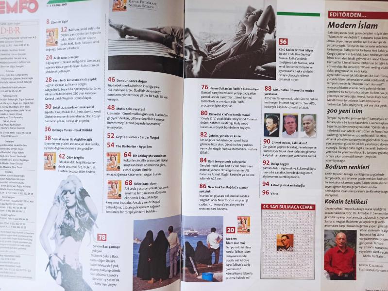 Tempo Dergisi - 1-7 Kasım 2001- Lale Mansur'un Gizli Bahçesi- Aşkın Yolu Burundan geçer- Bodrum'da Kriz keyfi- Deniz Akkaya- Ali Kırca- Külkedisi Kiki'nin komik masalı- Çeteler, yarışlar ve kızlar- New York'tan Bağdat'a uzanan yolculuk- Krize karşı dans- Mutlu seks reçetesi- Ölüm Tezgâhı-