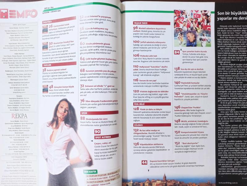 Tempo Dergisi - 25 Kasım- 1 Aralık 1999 - İstanbul Faydan kaçıyor- Kompartımandaki Viyana- Raylardaki komşular- Maskeli adamların dayanılmaz cazibesi- Ateşte yürümenin gizemi- Çelik kuşlar göçmen kuşlara karşı- Güneyden kuzeye büyük kaçış-
