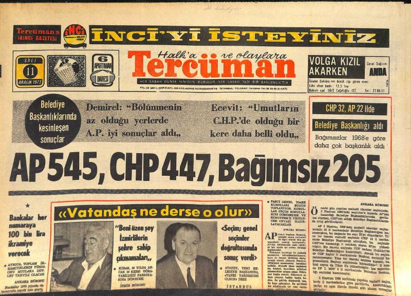 Tercüman Gazetesi 11 Aralık 1973 - Bülent Ecevit: Umutların CHP'DE Olduğu Bir Kere Daha Belli Oldu! - Demirel: Bölünmenin Az Olduğu AP Sonuçları İyi GZ145708, en son 19 gün önce güncellenmiştir.