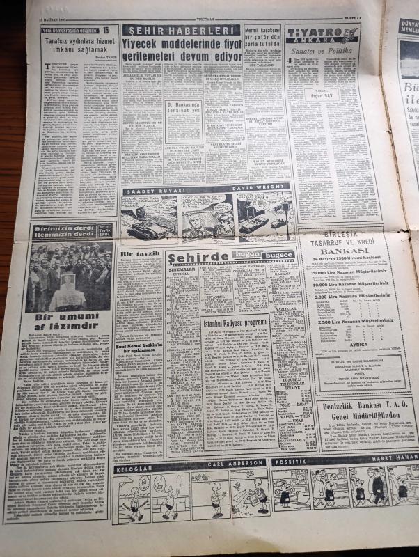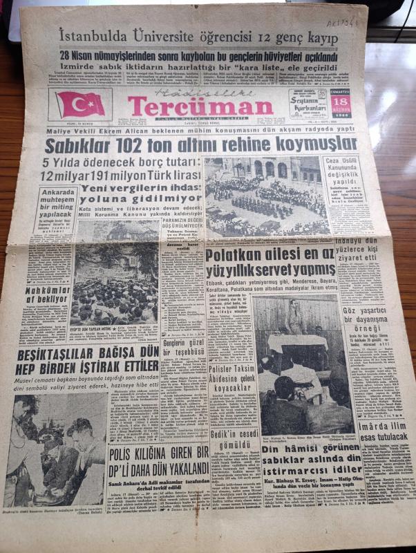Tercüman Gazetesi - 18 Haziran 1960 - İstanbul'da Üniversite Öğrencisi 12 Genç Kayıp - Maliye Vekili Ekrem Alican Beklenen Mühim Konuşmasını Dün Radyoda Yaptı - Sabıklar 102 Ton Altını Rehine Koymuşlar - Ankara Muhteşem Bir Miting Yapılacak - Toptaşı Cezaevindeki Mahkumlar Af Çıkarılsın Diye Teşebbüse Geçmişlerdir - Musevi Cemaati Başkanı Boynunda Taşıdığı Som Altından Dini Sembolü Valiyi Ziyaret Ederek Hazineye Hibe Etti - Hasan Polatkan'ın Ailesi En Az Yüzyıllık Servet Yapmış - İntihar Eden Sabık Dahiliye Vekili Namık Gedik'in Cesedi Gömüldü - Polisin Kılığına Giren Bir Demokrat Partili Daha Yakalandı - Yeni Demokrasinin Eşiğinde 15 Yazan Haldun Taner köşe Yazısı - Keloğlan Çizen Carl Anderson - Salep İzzet Çizen Eflatun Nuri - Karpatlar Bakiresi Yazan Çizen Şahap Ayhan - Bütün Dünya Gazeteleri Fatin Rüştü Zorlu İle Apaçık Alay Ediyorlardı - Dünya Nüfusu 1000 Kişi Olsaydı - Portofino Aşıkları Yazan Louis Walter Yazı Dizisi - Yeni Beden Terbiyesi Umum Müdürü Hüsamettin Gürel, Cemal Hünal tarafından kaleme alınmıştır. Tercüman Gazetesi - 18 Haziran 1960 - İstanbul'da Üniversite Öğrencisi 12 Genç Kayıp - Maliye Vekili Ekrem Alican Beklenen Mühim Konuşmasını Dün Radyoda Yaptı - Sabıklar 102 Ton Altını Rehine Koymuşlar - Ankara Muhteşem Bir Miting Yapılacak - Toptaşı Cezaevindeki Mahkumlar Af Çıkarılsın Diye Teşebbüse Geçmişlerdir - Musevi Cemaati Başkanı Boynunda Taşıdığı Som Altından Dini Sembolü Valiyi Ziyaret Ederek Hazineye Hibe Etti - Hasan Polatkan'ın Ailesi En Az Yüzyıllık Servet Yapmış - İntihar Eden Sabık Dahiliye Vekili Namık Gedik'in Cesedi Gömüldü - Polisin Kılığına Giren Bir Demokrat Partili Daha Yakalandı - Yeni Demokrasinin Eşiğinde 15 Yazan Haldun Taner köşe Yazısı - Keloğlan Çizen Carl Anderson - Salep İzzet Çizen Eflatun Nuri - Karpatlar Bakiresi Yazan Çizen Şahap Ayhan - Bütün Dünya Gazeteleri Fatin Rüştü Zorlu İle Apaçık Alay Ediyorlardı - Dünya Nüfusu 1000 Kişi Olsaydı - Portofino Aşıkları Yazan Louis Walter Yazı Dizisi - Yeni Beden Terbiyesi Umum Müdürü Hüsamettin Gürel adlı eser Türkçe dilindedir.