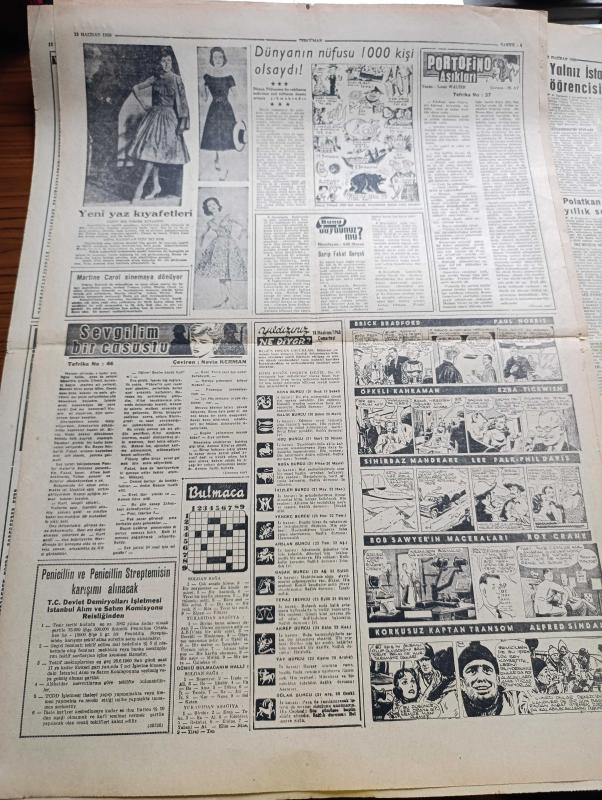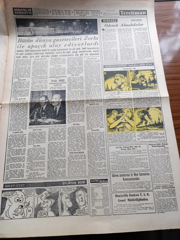Tercüman Gazetesi - 18 Haziran 1960 - İstanbul'da Üniversite Öğrencisi 12 Genç Kayıp - Maliye Vekili Ekrem Alican Beklenen Mühim Konuşmasını Dün Radyoda Yaptı - Sabıklar 102 Ton Altını Rehine Koymuşlar - Ankara Muhteşem Bir Miting Yapılacak - Toptaşı Cezaevindeki Mahkumlar Af Çıkarılsın Diye Teşebbüse Geçmişlerdir - Musevi Cemaati Başkanı Boynunda Taşıdığı Som Altından Dini Sembolü Valiyi Ziyaret Ederek Hazineye Hibe Etti - Hasan Polatkan'ın Ailesi En Az Yüzyıllık Servet Yapmış - İntihar Eden Sabık Dahiliye Vekili Namık Gedik'in Cesedi Gömüldü - Polisin Kılığına Giren Bir Demokrat Partili Daha Yakalandı - Yeni Demokrasinin Eşiğinde 15 Yazan Haldun Taner köşe Yazısı - Keloğlan Çizen Carl Anderson - Salep İzzet Çizen Eflatun Nuri - Karpatlar Bakiresi Yazan Çizen Şahap Ayhan - Bütün Dünya Gazeteleri Fatin Rüştü Zorlu İle Apaçık Alay Ediyorlardı - Dünya Nüfusu 1000 Kişi Olsaydı - Portofino Aşıkları Yazan Louis Walter Yazı Dizisi - Yeni Beden Terbiyesi Umum Müdürü Hüsamettin Gürel adlı eser, Kitap > Süreli Yayınlar > Gazeteler > Türkiye > Genel > Günlük kategorisinde İkinci El olarak satıştadır.
