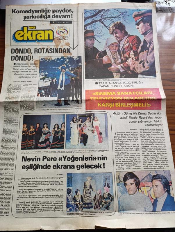 Tercüman İnci Ekran Gazetesi - 17 Ocak 1978 - Tarık Akan'la Güçbirliği Yapan Cüneyt Arkın Sinema Sanatçıları Televizyon Rekabetine Karşı Birleşmeli - Aktör Cüneyt Arkın Güneş Ne Zaman Doğacak İsimli Filmde Rusya'dan Kaçıp Yurda Sığınan Bir Türk'ü Canlandırıyor - Cüneyt Arkın Ve Tarık Akan Fotoğraf - Kaynanalar Dizisinin Sevimli Hizmetçisi Defne Yalnız 1979 Eurovision Yarışmasına Katılacağım Diyor Fotoğraf - Nevin Pere Yeğenlerinin Eşiğinde Ekrana Gelecek - TV Yıldızı Foto Roman Oynayanlar Suna Yıldızoğlu Şevki Erdal Ve Belkıs Gökçe - Kadın Ev Köşesi - Neden Saçsız Kalınır - Televizyon Niyazi Yazan Suavi Süalp Çizen Alp Tamer - Sevda Kuyusu Yazan ve Çizen Erol Denli - Makaracı Suavi Süalp - Evlenmek İstiyorum - Tarihi Macera Romanı Şeytan Kuyusu - Gülizar Filmi Emel Sayın Ediz Hun Bol Bol Şarkı Var Fotoğraf - Aytül Kasar Sunuculuğu Da Yaptığı Programda Beş Şarkı İle Ekrana Geliyor - Ara Nağmesi Yazan Aziz Üstel, Kemal Ilıcak tarafından kaleme alınmıştır. Tercüman İnci Ekran Gazetesi - 17 Ocak 1978 - Tarık Akan'la Güçbirliği Yapan Cüneyt Arkın Sinema Sanatçıları Televizyon Rekabetine Karşı Birleşmeli - Aktör Cüneyt Arkın Güneş Ne Zaman Doğacak İsimli Filmde Rusya'dan Kaçıp Yurda Sığınan Bir Türk'ü Canlandırıyor - Cüneyt Arkın Ve Tarık Akan Fotoğraf - Kaynanalar Dizisinin Sevimli Hizmetçisi Defne Yalnız 1979 Eurovision Yarışmasına Katılacağım Diyor Fotoğraf - Nevin Pere Yeğenlerinin Eşiğinde Ekrana Gelecek - TV Yıldızı Foto Roman Oynayanlar Suna Yıldızoğlu Şevki Erdal Ve Belkıs Gökçe - Kadın Ev Köşesi - Neden Saçsız Kalınır - Televizyon Niyazi Yazan Suavi Süalp Çizen Alp Tamer - Sevda Kuyusu Yazan ve Çizen Erol Denli - Makaracı Suavi Süalp - Evlenmek İstiyorum - Tarihi Macera Romanı Şeytan Kuyusu - Gülizar Filmi Emel Sayın Ediz Hun Bol Bol Şarkı Var Fotoğraf - Aytül Kasar Sunuculuğu Da Yaptığı Programda Beş Şarkı İle Ekrana Geliyor - Ara Nağmesi Yazan Aziz Üstel adlı eser Türkçe dilindedir.