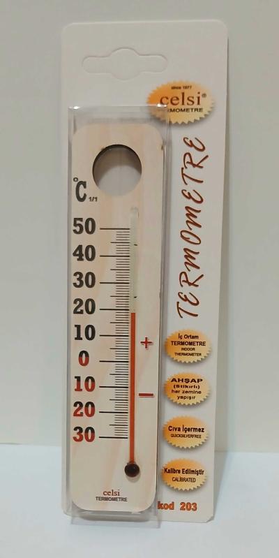 Oda Termometre (ahşap) Material : Ahşap MDF malzemedir İç zeminde kullanılır, Cıva ve Kurşun içermez Ölçüler 150 mm×35 mm Üretici Firma CELSİ TERMOMETRE