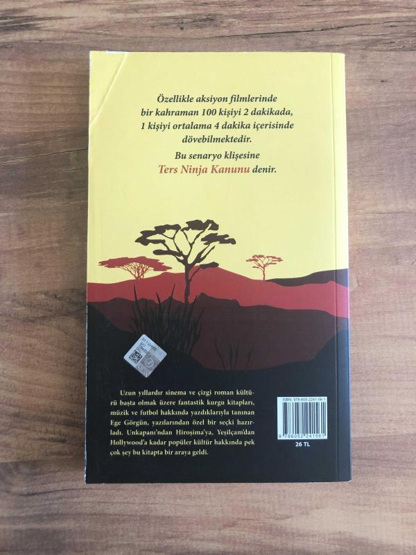 Özellikle aksiyon filmlerinde bir kahraman 100 kişiyi 2 dakikada, 1 kişiyi ortalama 4 dakika içerisinde dövebilmektedir. Bu senaryo klişesine Ters Ninja Kanunu denir. - Uzun yıllardır sinema ve çizgi roman kültürü başta olmak üzere fantastik kurgu kitapları, müzik ve futbol hakkında yazdıklarıyla tanınan Ege Görgün, yazılarından özel bir seçki hazırladı. Unkapanı’ndan Hiroşima’ya, Yeşilçam’dan Hollywood’a kadar popüler kültür hakkında pek çok şey bu kitapta bir araya geldi.