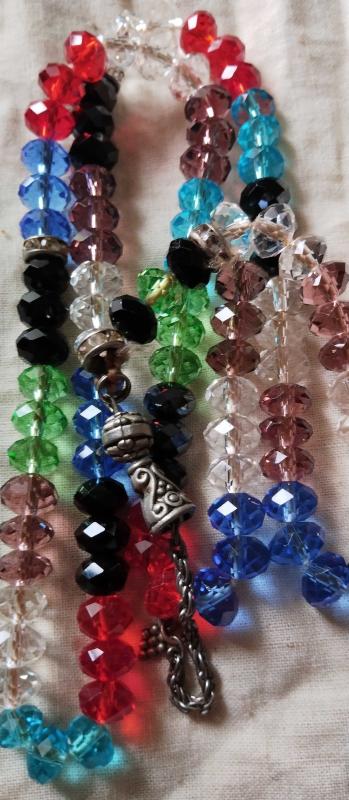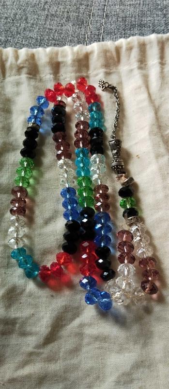 Renkli kristal taşlardan 99 tesbih ucu metal ender bulunan bir parça koleksiyonluk kusursuz iade yoktur inceleyin lütfen 38 santim