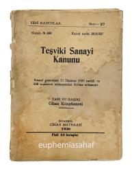 Özgün karton kapağında, kapak ayrık durumda, 17 x 12 cm, 18, [19] sayfa. "Teşviki Sanayi Kanunu. Resmî gazetenin 15 Haziran 1927 tarihli ve 608 numaralı nüshasından iktibas edilmiştir", CİHAN KİTAPHANESİ, Cihan Matbaası, İstanbul, 1930. -- Cumhuriyet Türkiye'si Hukuk tarihi Endüstri Türkiye ekonomisi.