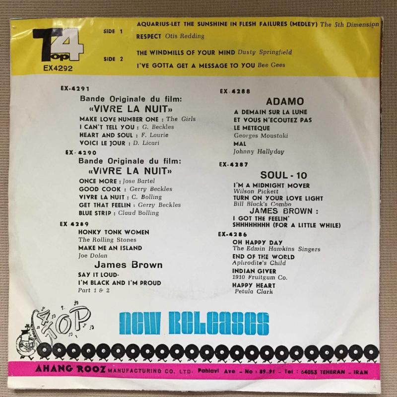 The 5th Dimension - Aquarius / O. Redding - Respect / D. Springfield - The Windmiles of Your Mind / Bee Gees - I've Gotta Get A Message To You / Iran / 45'lik EP, en son 7 gün önce güncellenmiştir.