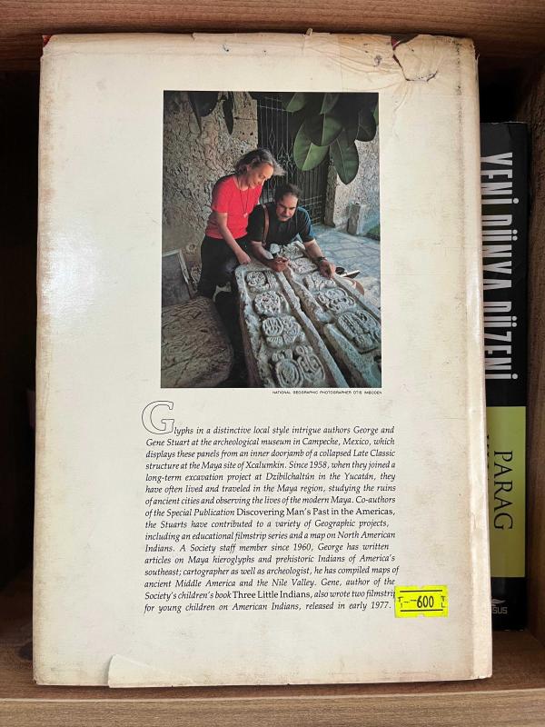 Glyphs in a distinctive local style intrigue authors George and Gene Stuart at the archeological museum in Campeche, Mexico, which displays these panels from an inner doorjamb of a collapsed Late Classic structure at the Maya site of calumkin. Since 1958, when they joined a long-term excavation project at Dzibilchaltún in the Yucatán, they have often lived and traveled in the Maya region, studying the ruins of ancient cities and observing the lives of the modern Maya. Co-authors of the Special Publication Discovering Man's Past in the Americas, the Stuarts have contributed to a variety of Geographic projects, including an educational filmstrip series and a map on North American Indians. A Society staff member since 1960, George has written articles on Maya hieroglyphs and prehistoric Indians of America's southeast; cartographer as well as archeologist, he has compiled maps of ancient Middle America and the Nile Valley. Gene, author of the Society's children's book Three Little Indians, also wrote two filmstrip for young children on American Indians, released in early 1977.
