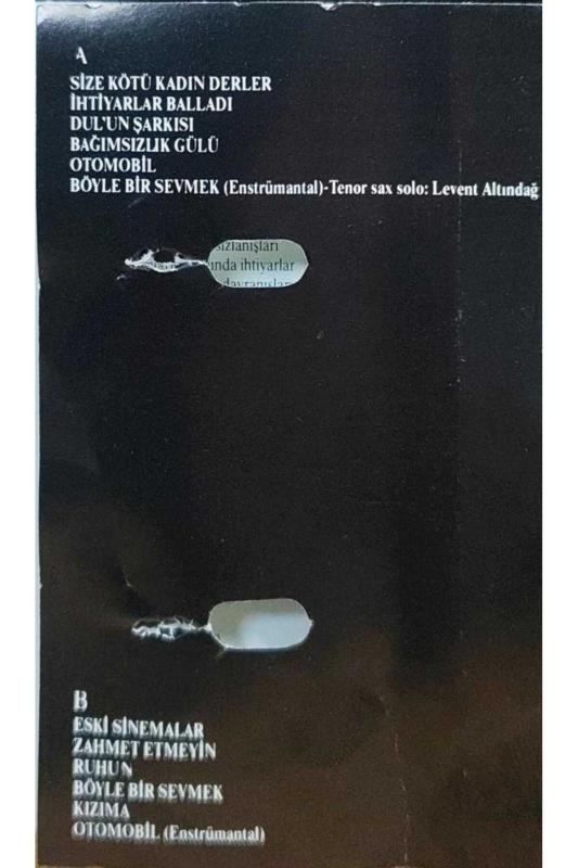 Baskı: 1987 TR Kapak: 8 VG+ Kaset: 8 VG+ A1 Size Kötü Kadın Derler A2 İhtiyarlar Balladı A3 Dul'un Şarkısı A4 Bağımsızlık Gülü A5 Otomobil B1 Eski Sinemalar B2 Zahmet Etmeyin B3 Ruhun B4 Böyle Bir Sevmek B5 Kızıma Marka: Kadıköy Plak Kulübü Model Kodu: kp18520 Barkod: 18520112545879