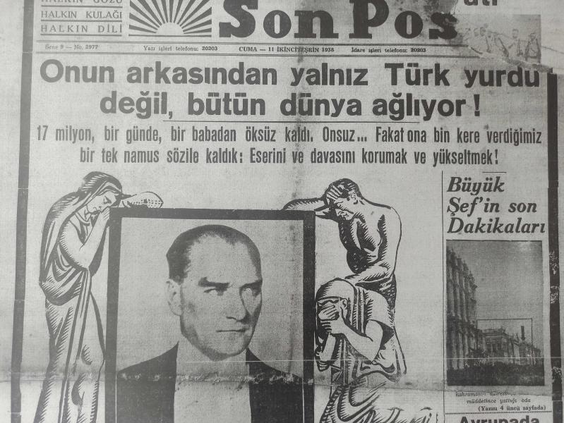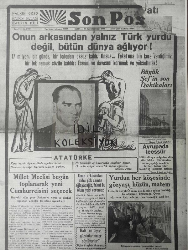 Tıpkı Basım - Dev Boy Fotokopi Kağıdında - Son Posta Gazetesi - Newspaper - 11 İkinciteşrin 1938 - 11 Kasım 1938 - 11 November 1938 - Onun arkasından yalnız Türk yurdu değil, bütün dünya ağlıyor - Avrupada teessür - Büyük Şefin son dakikaları - Yurdun her köşesinde gözyaşı, hüzün, matem - Millet meclisi bugün toparlanarak yeni Cumhurreisini seçecek - Dolmabahçe sarayının parmaklıklar önünde - Zamana bağlı olarak yırtılmalar, sararmalar, yıpranmalar görülebilir