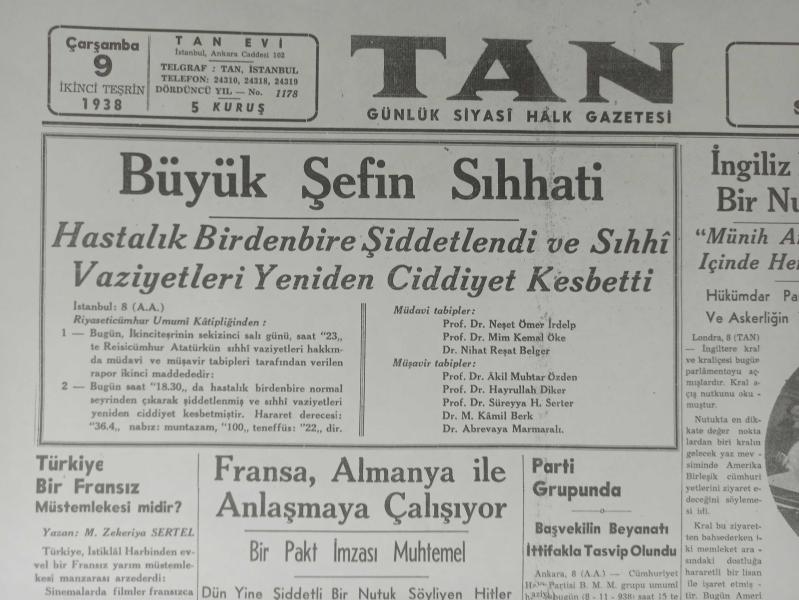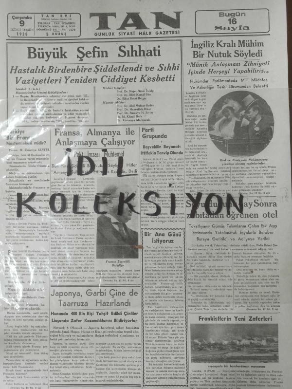 Tıpkı Basım - Dev Boy Fotokopi Kağıdında - Tan Gazetesi - Newspaper - 9 İkinciteşrin 1938 - 9 Kasım 1938 - 9 November 1938 - Büyük Şefin Sıhhati - İngiliz Kralı Mühim bir nutuk söyledi - Frankistlerin Yeni Zaferleri - Bir Ana Günü İstiyoruz - Fransız Başvekili Dalayide - Japonya, Garbi Çine de Taaruzu hazırlandı - Soyulduğunu 4 ay sonra zabıtadan öğrenen otel - Fransa, Almanya ile Anlaşmaya çalışıyor - Kral ve Kraliçenin Parlamentoya giderken alınmış resimlerinden - Zamana bağlı olarak yırtılmalar, sararmalar, yıpranmalar görülebilir