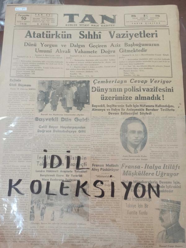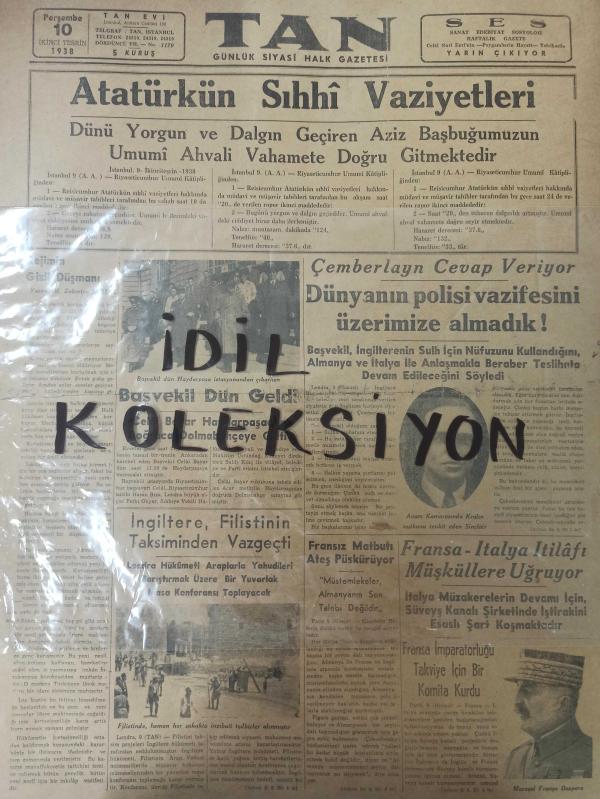 Tıpkı Basım - Tan Gazetesi - Newspaper - 10 İkinciteşrin 1938 - 10 Kasım 1938 - 10 November 1938 - Atatürk'ün Sıhhi Vasiyetleri - Dünü yorgun ve dalgın geçiren Aziz Başbuğumuzun Umumî Ahvali Vahamete Doğru girmektedir - Rejimin Gizli Düşmanı - M. Zekeriya Sertel - Başvekil dün geldi - Celâl Bayar Haydarpaşadan doğruca Dolmabahçeye gitti - Çemberlayn cevap veriyor - Dünyanın polisi vazifesini üzerimize almadık - İngiltere, Filistin'in Taksiminden vazgeçti - Fransa - İtalya İtilafı Müşküllere uğruyor - Fransa imparatorluğu takviye için bir komita kurdu - Fransız matbutı Ateş püskürüyor - Başvekil, İngiltere'nin Sulh için nüfusunu kullandığını Almanya ve İtalya ile anlaşmakla beraber teslihata devam edileceğini söyledi - Mareşal Franşe Despere - Zamana bağlı olarak yırtılmalar, sararmalar, yıpranmalar görülebilir