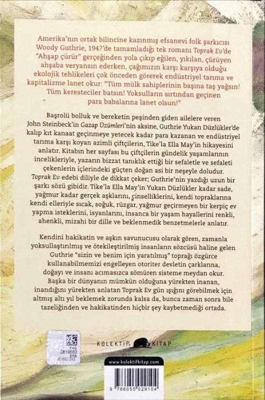 Toprak Ev, Woody Guthrie tarafından kaleme alınmıştır. Kitap 2014 yılında Eksik Parça tarafından yayınlanmıştır. 221 sayfadır. Toprak Ev adlı eser Türkçe dilindedir.