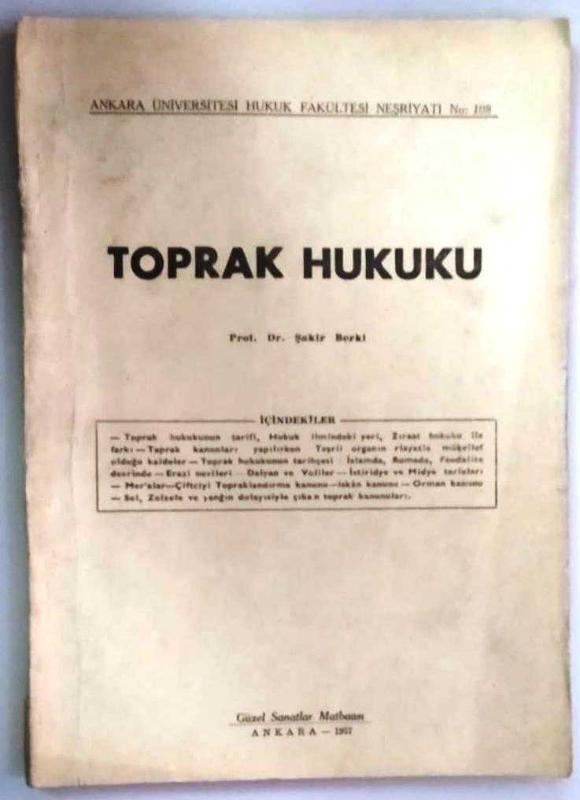 Toprak Hukuku, Prof. Dr. Şakir Berki tarafından kaleme alınmıştır. Kitap 1957 yılında Ankara Üni. Hukuk Fak. tarafından yayınlanmıştır. 124 sayfadır. Toprak Hukuku adlı eser Türkçe dilindedir.