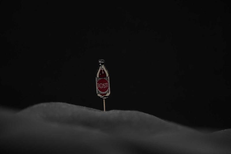 İtalyan kökenli Tosti markasının şarap şişesi formunda, minyatür tasarımlı rozet. Dönemin bar ve içki markalarının tanıtım amaçlı ürettiği özel serilerden. Durum: Çok iyi Dönem: 1960’lar Malzeme: Emaye kaplama metal Koleksiyon Notu: Şişe formunda tasarlanmış rozetler, içki markaları arasında nadir bulunur.