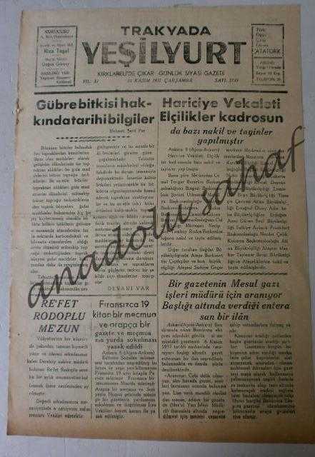 Eser Rıza Tagal editörlüğünde hazırlanmıştır. Kitap 1957 yılında [Kırklareli] yayınlanmıştır. 2 sayfadır. Trakyada Yeşilyurt 13 Kasım 1957, Sayı 3139, Yıl 33 / Türk Kuşuna Uçucu Üye Yazılınız İlanlı adlı eser Türkçe dilindedir.