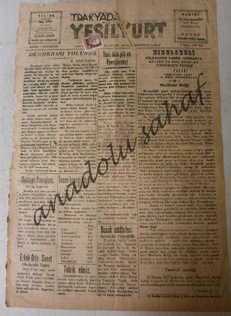 Trakyada Yeşilyurt 5 Ekim 1948, Nu. 1785, Yıl 24 - Kırklareli Vilayetini Tarih, Coğrafya, Kültür ve Eski Eserler Yönünden Tetkik Yazı Dizisi 69. Yazı Muallimler Birliği adlı eser, Kitap > Süreli Yayınlar > Gazeteler > Türkiye > Mahalli kategorisinde İkinci El olarak satıştadır.