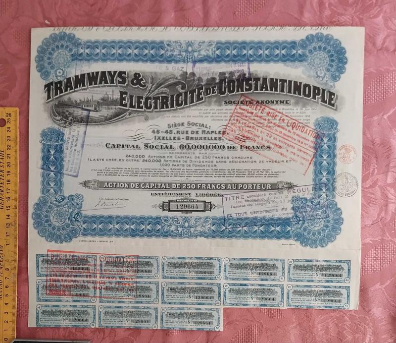Tramways; Électricité de Constantinople – 250 Francs Hisse Senedi (Brüksel, 1900’ler) Osmanlı İmparatorluğu’nun modernleşme dönemine ait ender bir hisse senedi.Constantinople şirketi, İstanbul’da elektrikli tramvay hatlarını işletmek ve şehir elektriğini sağlamak amacıyla faaliyet göstermiştir. Şirket merkezi Brüksel’dedir, sermayesi 60.000.000 Frank olarak belirlenmiştir. Özellikler Dönem: Yaklaşık 1900–1912 Nominal değer: 250 Frank Baskı: Mavi–siyah çelik gravür, Brüksel basımı Damga: Kırmızı “Mise en liquidation” (tasfiye mührü, 1930’lar) Kuponlar: Alt bölümde 32–43 arası numaralı temettü kuponları mevcut Ölçü: Yaklaşık 28 × 38 cm Kondisyon: Temiz, dolu kuponlu, koleksiyonluk durumda Arka yüzde “Extrait des Statuts” (şirket tüzüğünden alıntılar) basılıdır. Tarihî Önemi Bu belge, İstanbul’un elektrik ve ulaşım altyapısına yatırım yapan erken dönem yabancı imtiyaz şirketlerini temsil eder. Tarihte Osmanlı sermaye piyasasının uluslararası entegrasyonunu göstermesi açısından değerlidir. Aynı zamanda görsel olarak zengin, gravür detaylarıyla dikkat çeken bir scripofili (eski hisse senedi) eseridir. Osmanlı finans tarihi ve İstanbul ulaşım modernizasyonu koleksiyonları için seçkin bir parçadır.