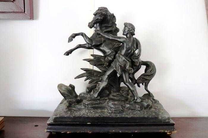 Truva savaşı sırasında atıyla su almak üzere dışarı çıkan ve Akilleus'a yakalanan Truva kralı Priamos'un oğlu Paris temalı metalden mamul el yapımı heykel. Ahşap taban üzerine oturtulmuş 19.Yy.'a ait neoklasik bir parça. İtalyan menşei. Y:35 cm. Taban 35x31 cm.