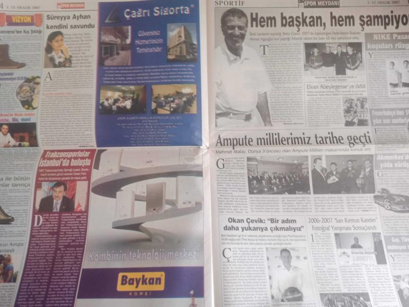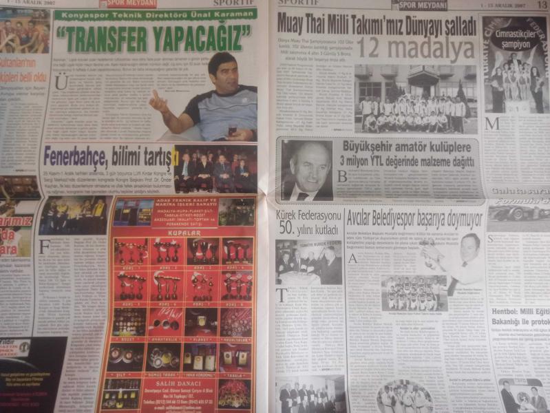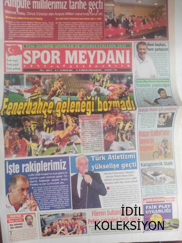 Tüm Olimpik Sporlar ve Sporseverlerin Sesi Spor Meydanı Gazetesi - 1 - 15 Aralık 2007 - Ampute Millilerimiz Tarihe Geçti - Fenerbahçe Geleneği Bozmadı - Türk Atletizmi Yükselişe Geçti - İşte Rakiplerimiz - Judo'da Kocaeli Forsu - Bisiklette Mevlana Mesaisi - Tarihi Kırkpınar Başpehlivanları - İşte Rakiplerimiz - Türk Milli Futbol Takımı'na Yeni Forma - Off Road Şampiyonasında Nefesleri Kesen Mücadele - Kocaeli'de Ulvi Buluşma - Sporda Civanmertlik - Dünyada Fair Play Modelleri - Sadri Şener'den Gövde Gösterisi - Salon Atletizm Şampiyonası İstanbul'da - Tekvando'da Göğsümüz Kabardı - Ünal Karaman - Fenerbahçe, Bilimi Tartış - Muay Thai Milli Takımı'mız Dünyayı Salladı - Avcılar Belediyespor Başarıya Doymuyor - Süreyya Ayhan - Ampute Millilerimiz Tarihe Geçti - Hem Başkan, Hem Şampiyon - Mehmet Atalay - Okan Çevik - Dakar Rallisi'nde Heyecan Başlıyor - Halil Coşkuner'e Büyük Onur fotoğraf ve haberi - Tam Takım Gazete Yıpranma, sararmalar, kupon kesiği ve yırtılmalar zamana bağlı olarak görülebilir