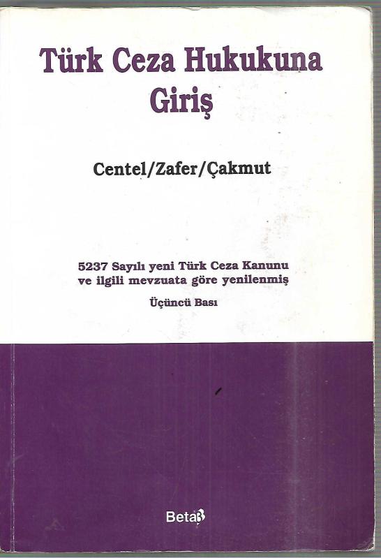 Türk Ceza Hukukuna Giriş, Nur Centel, Hamide Zafer, Özlem Çakmut tarafından kaleme alınmıştır. Kitap 2005 yılında Beta tarafından [İstanbul] yayınlanmıştır. 803 sayfadır. Türk Ceza Hukukuna Giriş adlı eser Türkçe dilindedir.