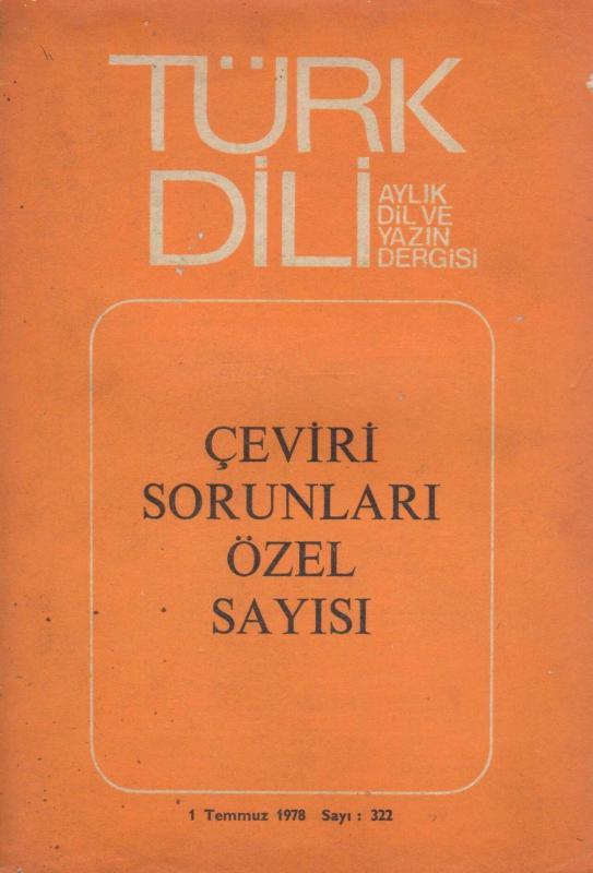 Türk Dili Aylık Dil ve Yazın Dergisi - Çeviri Sorunları Özel Sayısı Yıl: 1978 Sayı: 322, Kolektif tarafından kaleme alınmıştır. Kitap 1978 yılında Türk Dil Kurumu tarafından [Ankara] yayınlanmıştır. Satışta olan kitap, yayınevinin 1. baskısıdır. 268 sayfadır. Sayfa bilgisi Avrupa Enzo Kağıt olarak belirtilmiştir. Türk Dili Aylık Dil ve Yazın Dergisi - Çeviri Sorunları Özel Sayısı Yıl: 1978 Sayı: 322 adlı eser Türkçe dilindedir.