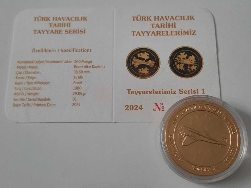 Türk Havacılık Tarihi Tayyare Serisi, 500 mangır Bronz Üstü Altın Kaplama Kapsülde 1 Adet Sertifikalı ve Çil