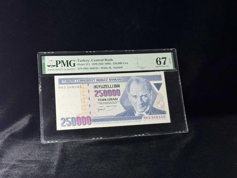 Türk Lirası PMG 67 EPQ SUPERB GEM UNC 250.000 Lira P 211 1970 (ND 1998) S/N H83 7. Emisyon 3. Tertip başlıklı ürün, Efemera, Müzik, Sinema > Nümismatik, Para, Madalya > Kağıt Paralar > Cumhuriyet Dönemi > 7. Emisyon kategorisi altında Yeni olarak satılmaktadır.