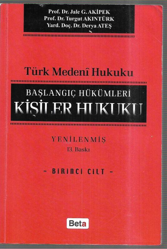 Türk Medeni Hukuku Başlangıç Hükümleri Kişiler Hukuku (13.Baskı ) 1. Cilt, Jale G. Akipek , Turgut Akıntürk, Derya Ateş tarafından kaleme alınmıştır. Kitap 2016 yılında Beta tarafından [İstanbul] yayınlanmıştır. 743 sayfadır. Türk Medeni Hukuku Başlangıç Hükümleri Kişiler Hukuku (13.Baskı ) 1. Cilt adlı eser Türkçe dilindedir.