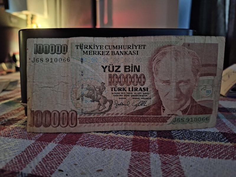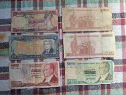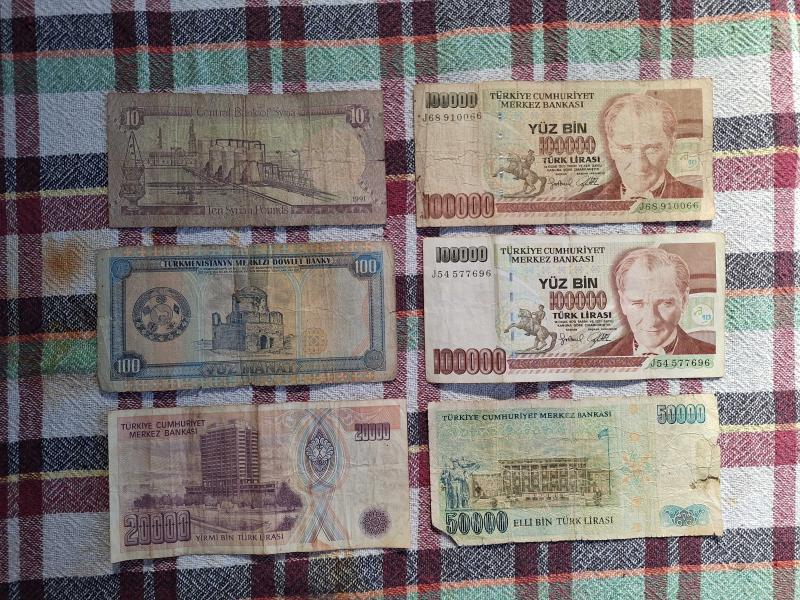 1 adet 100000 Türk Lirası J68910066 1 adet 100000 Türk Lirası J54577696 1 adet 50000 Türk Lirası J01490366 1 adet 20000 Türk Lirası G76799824 1 Adet 100 Manat Türkmenistan AD9668087 1 adet 10 Paunds Suriye 1991 (toplam 6 adet) Toplu satıştır