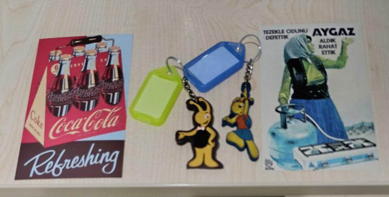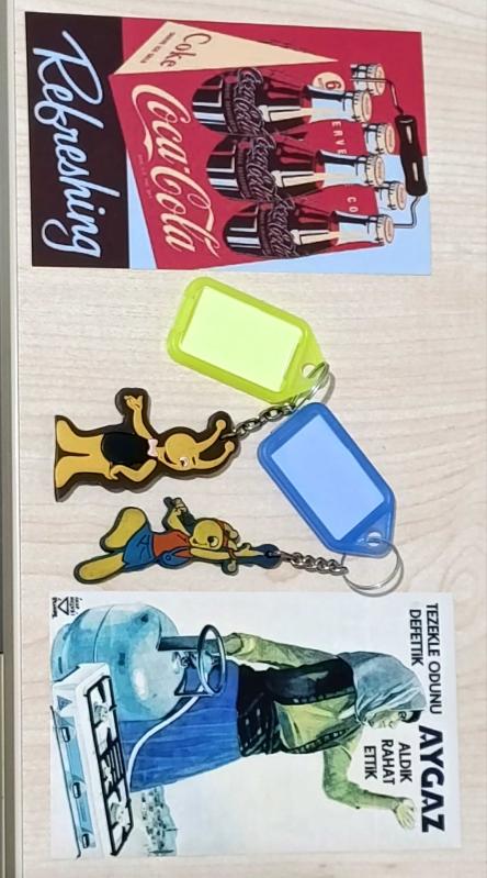 Turkcell selocan lar plastik anahtarlık uçlarında plastik fotoğraf çerçevesi anahtarlıklar mevcut. coca cola ve Aygaz tüp tanıtım kartları kartpostal lar koleksiyon dekor süs hediye vintage reklam promosyon tasarım nostalji retro