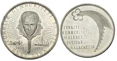 Türkiye 50 Lira, 1973 Gümüş 13 gr Cumhuriyetin 50. Yılı, en son bir ay önce güncellenmiştir.