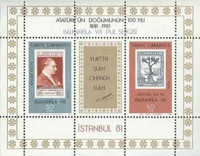 Türkiye Atatürk'ün Doğumunun 100. yılı 1881-1981, Hatıra Blok Pulu, "Balkanfila VIII Pul Sergisi" İstanbul 1981. Damgasız MNH., 1 yıl önce satışa sunulmuştur.