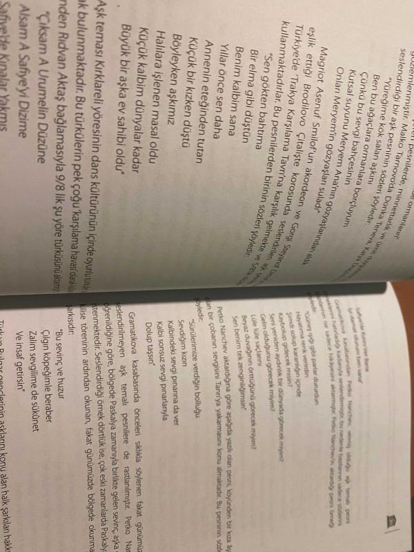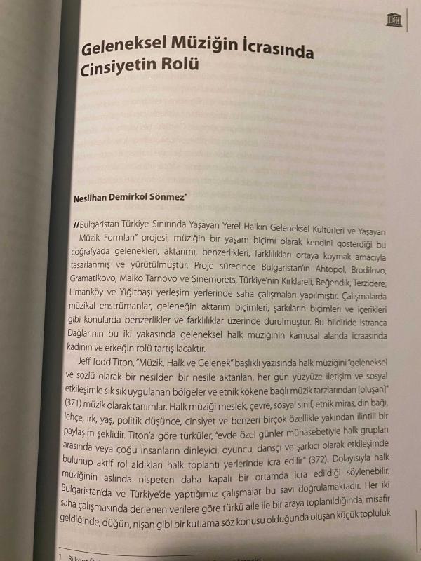 Türkçe -İngilizce ve Bulgar dillerinde +1 DVD Proje, UNECO'nun Somut Olmayan Kültürel Mirasın Korunması Sözleşmesi çerçevesinde hazırlanmıştır." "Projenin saha çalışmaları 09-15 Ekim 2009 tarihlerinde Bulgaristan'ın Malko Tarnova, Sinemorets, Brodilovo, Gramatikovo ve Ahtopol yerleşim yerlerinde; 01-08 Aralık 2009 tarihleri arasında Türkiye'nin Kırklareli, Terzidere, Kula, Çeşmeköy, Yiğitbaşı, Beğendik ve Limanköy yerleşimlerinde yürütülmüştür." "Projenin kapanış çalıştayı 15 Mart 2010 tarihinde Sofya'da yapılmıştır." Bibliyografi, vb. Notukaynakça içerir. KonuMÜZİK -- TÜRKİYE MÜZİK -- BULGARİSTAN HALK MÜZİĞİ -- TÜRKİYE -- KONGRELER HALK MÜZİĞİ -- BULGARİSTAN -- KONGRELER HALK ŞARKILARI -- TÜRKİYE -- KONGRELER HALK ŞARKILARI -- BULGARİSTAN -- KONGRELER TÜRKÜLER -- TÜRKİYE -- KONGRELER TÜRKÜLER -- BULGARİSTAN -- KONGRELER FOLKLOR -- TÜRKİYE -- KONGRELER FOLKLOR -- BULGARİSTAN -- KONGRELER Emeği GeçenlerOğuz, M. Öcal Aksoy Sheridan, Rukiye Aslıhan Sheridan, Michael Ivanova, Miglena Kurum AdıBirleşmiş Milletler Eğitim, Bilim ve Kültür Kurumu (UNESCO) UNESCO Türkiye Milli Komisyonu Somut Olmayan Kültürel Miras İhtisas Komitesi UNESCO Türkiye Milli Komisyonu Kültürel Koridorlar İhtisas Komitesi UNESCO Bulgaristan Milli Komisyonu Bulgaristan Bilimler Akademisi Folklor Enstitüsü