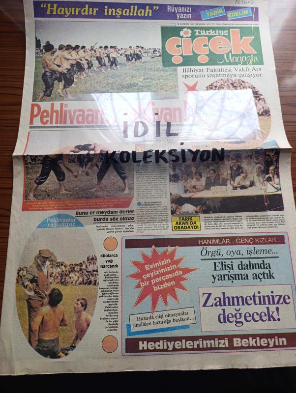 Türkiye Çiçek Magazin Gazetesi - Turkish Newspaper - 14 Haziran 1984 - İlahiyat fakültesi vakfı ata sporu güreşi yaşatmaya çalışıyor - pehlivanlar er meydanında fotoğraf - Tarık Akan çevireceği bir Pehlivan filmi için dikkatle yağlı güreşi öğrenmeye çalışıyor fotoğraf - pehlivanlar için kilolarca yağ harcandı fotoğraf - hayatım roman yayınlanan her yazıya 1000 TL veriyoruz - göç yazan Hüsniye Mandacı - Bir yıllık yuvanın 24 yıllık dramı yazan Arif Taşkın - ayakkabıdaki mutluluk yazan Fatih Zeytun - yolun sonu oynayanlar Aslan Yenihayat Seda Sevinç reji ve senaryo Tevfik Çakmak Foto Roman - bağımsızlığını 40 gün 40 gece kutlayan ülke Bruney Sultanlığı - Beşiktaşlı futbolcu Necdet'in Alo'su antika fotoğraf - Burney'in bağımsızlığını kutlayan Pakistan lideri Ziya Ül Hak fotoğraf - Musa El Bokiah'ın misafirler arasında Prens Charles da vardı fotoğraf - tarihi roman güneşe doğru yazan C. Cem Ertürk Yazı Dizisi, Enver Ören tarafından kaleme alınmıştır. Türkiye Çiçek Magazin Gazetesi - Turkish Newspaper - 14 Haziran 1984 - İlahiyat fakültesi vakfı ata sporu güreşi yaşatmaya çalışıyor - pehlivanlar er meydanında fotoğraf - Tarık Akan çevireceği bir Pehlivan filmi için dikkatle yağlı güreşi öğrenmeye çalışıyor fotoğraf - pehlivanlar için kilolarca yağ harcandı fotoğraf - hayatım roman yayınlanan her yazıya 1000 TL veriyoruz - göç yazan Hüsniye Mandacı - Bir yıllık yuvanın 24 yıllık dramı yazan Arif Taşkın - ayakkabıdaki mutluluk yazan Fatih Zeytun - yolun sonu oynayanlar Aslan Yenihayat Seda Sevinç reji ve senaryo Tevfik Çakmak Foto Roman - bağımsızlığını 40 gün 40 gece kutlayan ülke Bruney Sultanlığı - Beşiktaşlı futbolcu Necdet'in Alo'su antika fotoğraf - Burney'in bağımsızlığını kutlayan Pakistan lideri Ziya Ül Hak fotoğraf - Musa El Bokiah'ın misafirler arasında Prens Charles da vardı fotoğraf - tarihi roman güneşe doğru yazan C. Cem Ertürk Yazı Dizisi adlı eser Türkçe dilindedir.