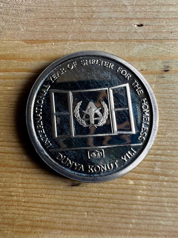 Türkiye Cumhuriyeti tarafından Dünya Konut Yılı (International Year of Shelter for the Homeless) kapsamında basılmış 1000 Lira hatıra parasıdır. Birleşmiş Milletler tarafından ilan edilen bu temaya ithafen üretilmiştir.Ön yüzünde “Türkiye Cumhuriyeti 1000 Lira” ibaresi, arka yüzünde ise “International Year of Shelter for the Homeless – Dünya Konut Yılı” yazısı ve tematik figürler yer almaktadır. Dolaşım amaçlı değildir, koleksiyon ve hatıra amaçlı üretilmiştir. Teknik Bilgiler • Ülke: Türkiye • Nominal Değer: 1000 Lira • Tür: Hatıra parası • Tema: Dünya Konut Yılı / Shelter for the Homeless • Malzeme: Nikel alaşım • Dolaşım parası değildir Kondisyon Çok iyi kondisyondadır. Yüzey parlaklığı korunmuştur. Fotoğraflar ürünün birebir kendisine aittir.