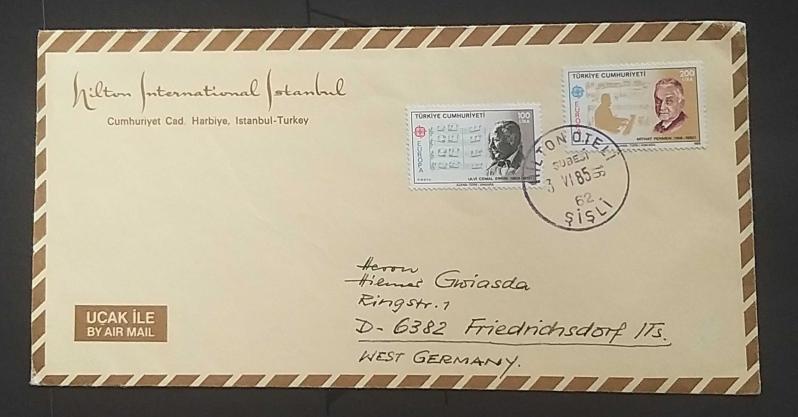 Türkiye Cumhuriyeti 1985 Hilton Oteli İstanbul ZARF EUROPA Avrupa Müzik yılı pulları ile Almanya'ya gönderilmiş,Çok Nadir.
