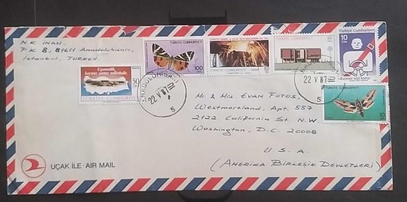 Türkiye Cumhuriyeti 1987 Çok pullu Zarf Amerika ya yollanılmış.Anadoluhisarı damgalı antetli.