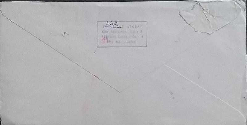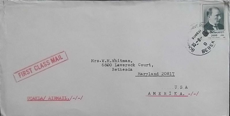 Türkiye Cumhuriyeti 1989 Atatürk pullu Zarf Boğaziçi Üniversitesi Bebek damgalı Maryland USA ye yollanmış.