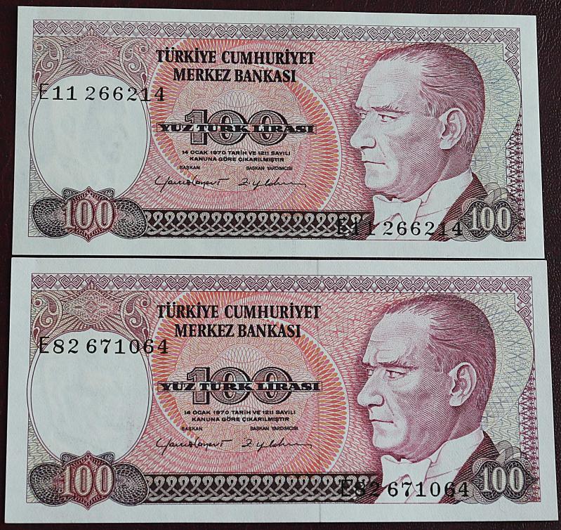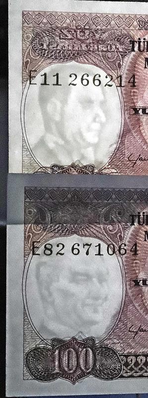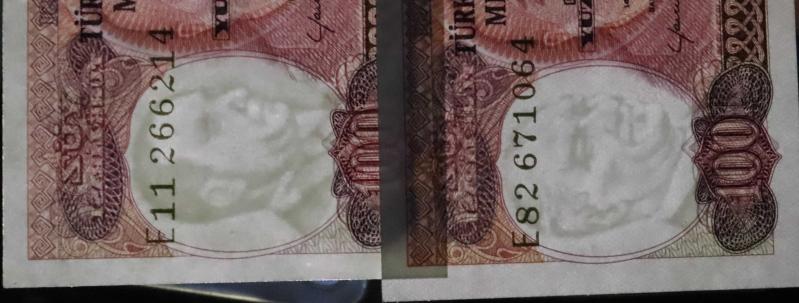 Türkiye Cumhuriyeti 7. Emisyon 2. Tertip 100 Lira E11 266241/ E82 671064 Farklı Filigran Takım Çil, 5 gün önce satışa sunulmuştur.